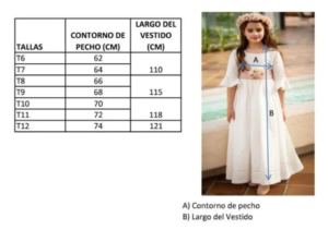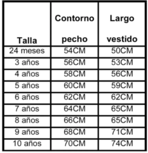 Medir el contorno de pecho de la niña sin ropa y sumarle 2 cm más de la medida, si a la niña la ropa ajustada le incomoda sumar 3 cm más. Ejemplo: si su contorno de pecho es 62 cm sería 64 cm equivalente a la talla 7.