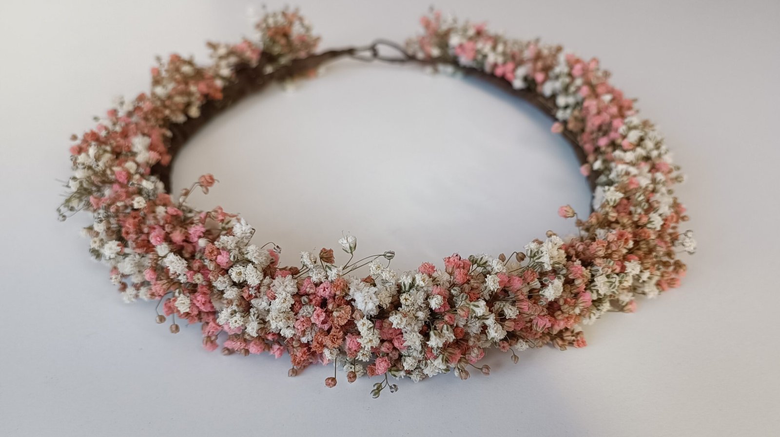Corona con hortensias preservadas, combinada de paniculata natural y rosa.