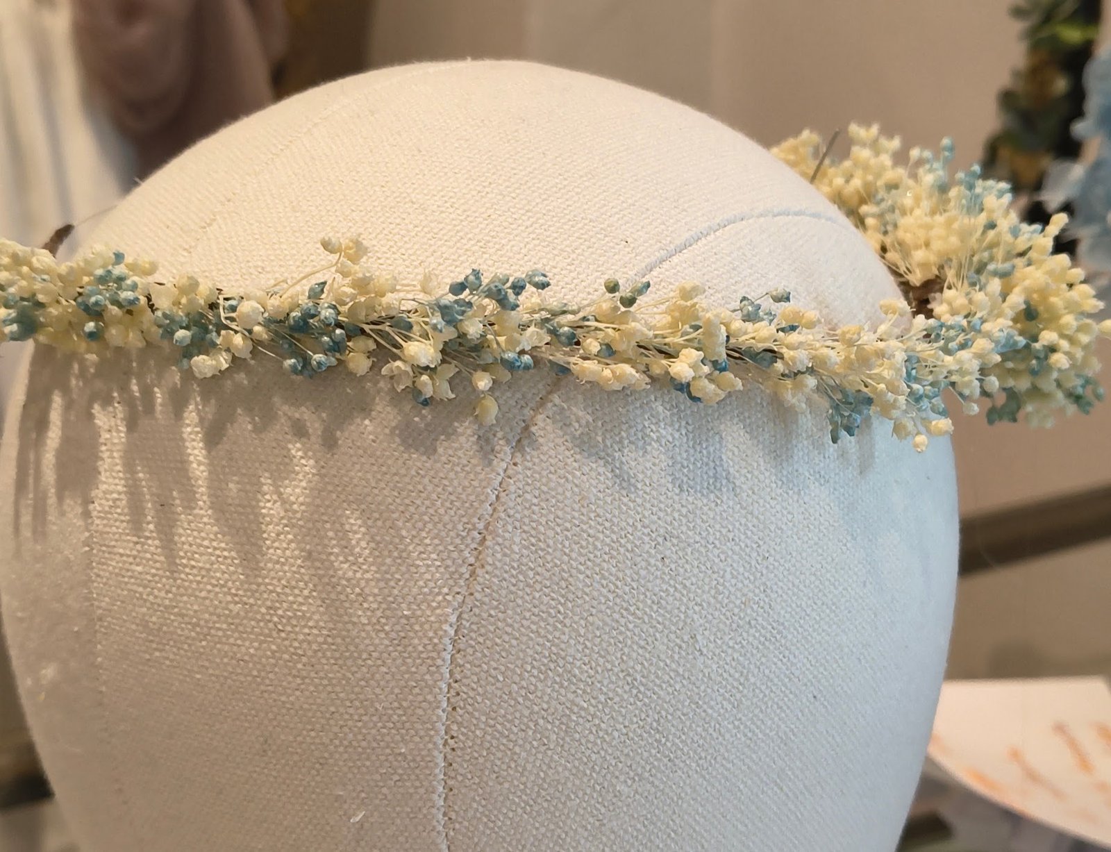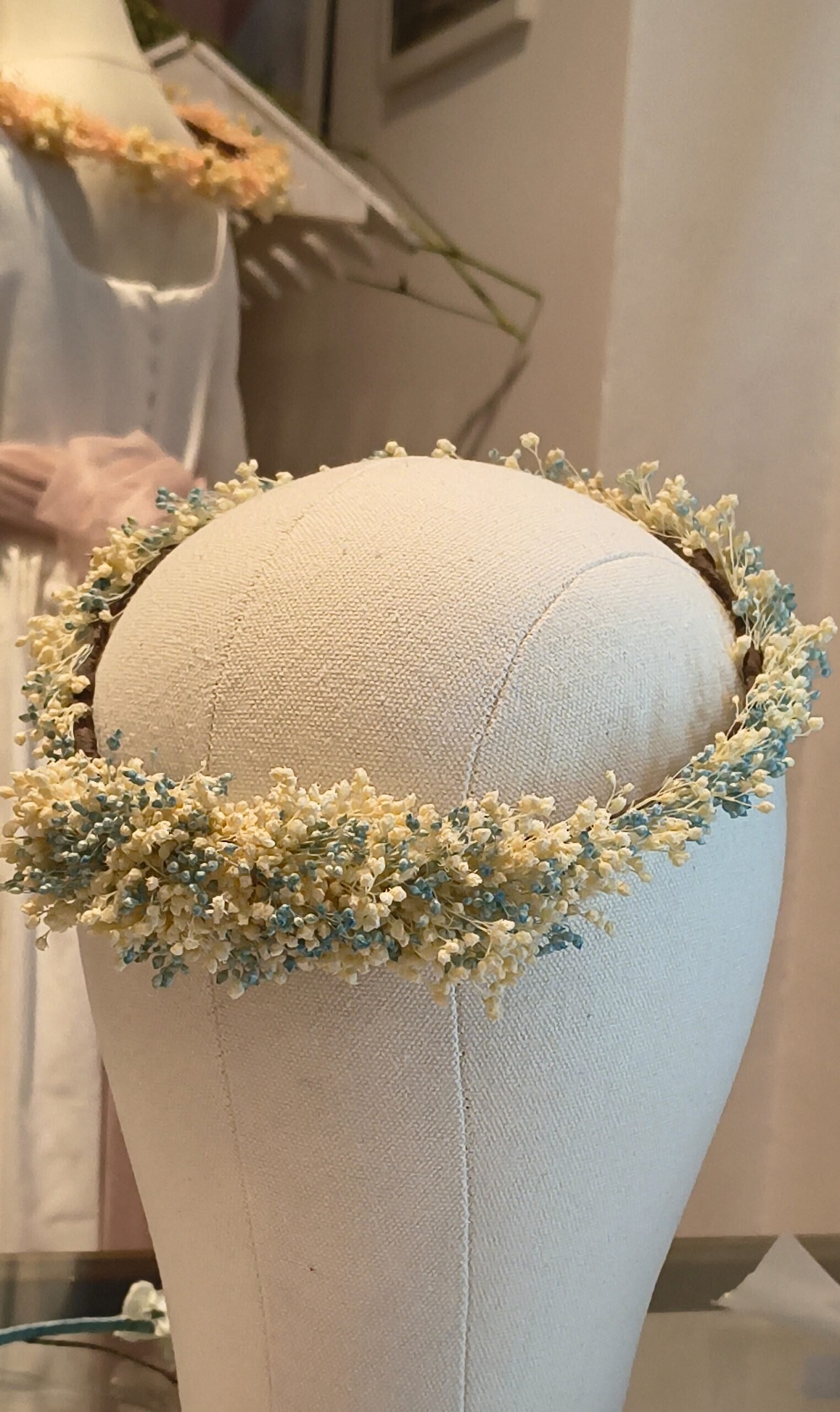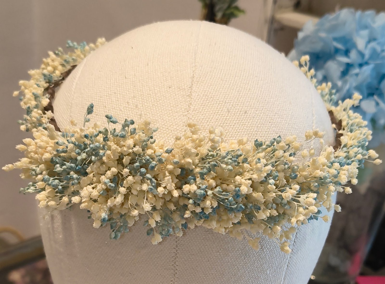 Corona completa silvestre con flores preservadas color rosa claro con blanco natural. y aguamarina con blanco natural