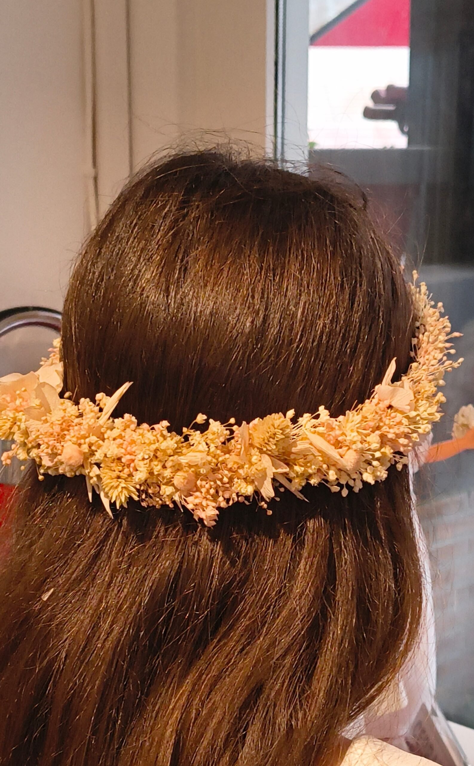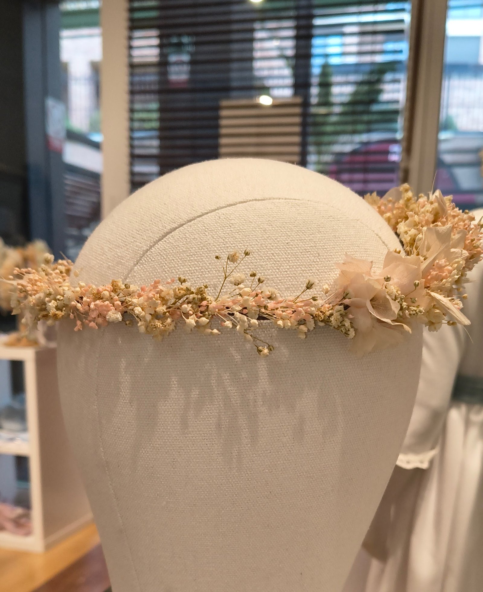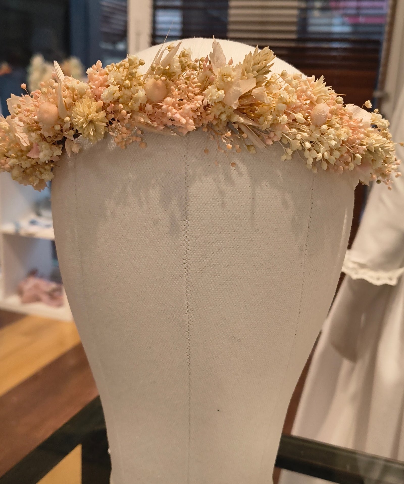 Corona completa silvestre con flores preservadas color rosa claro con blanco natural.