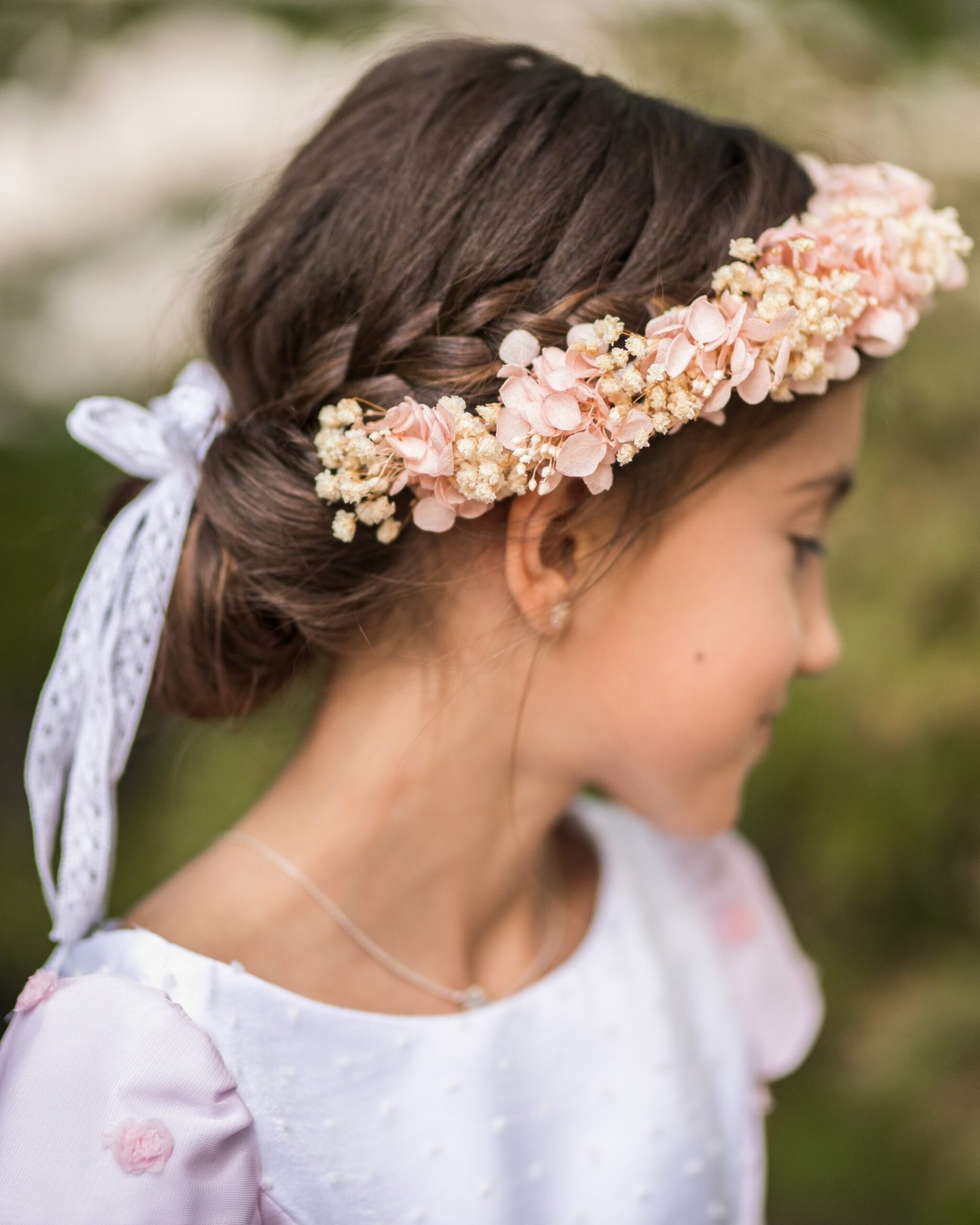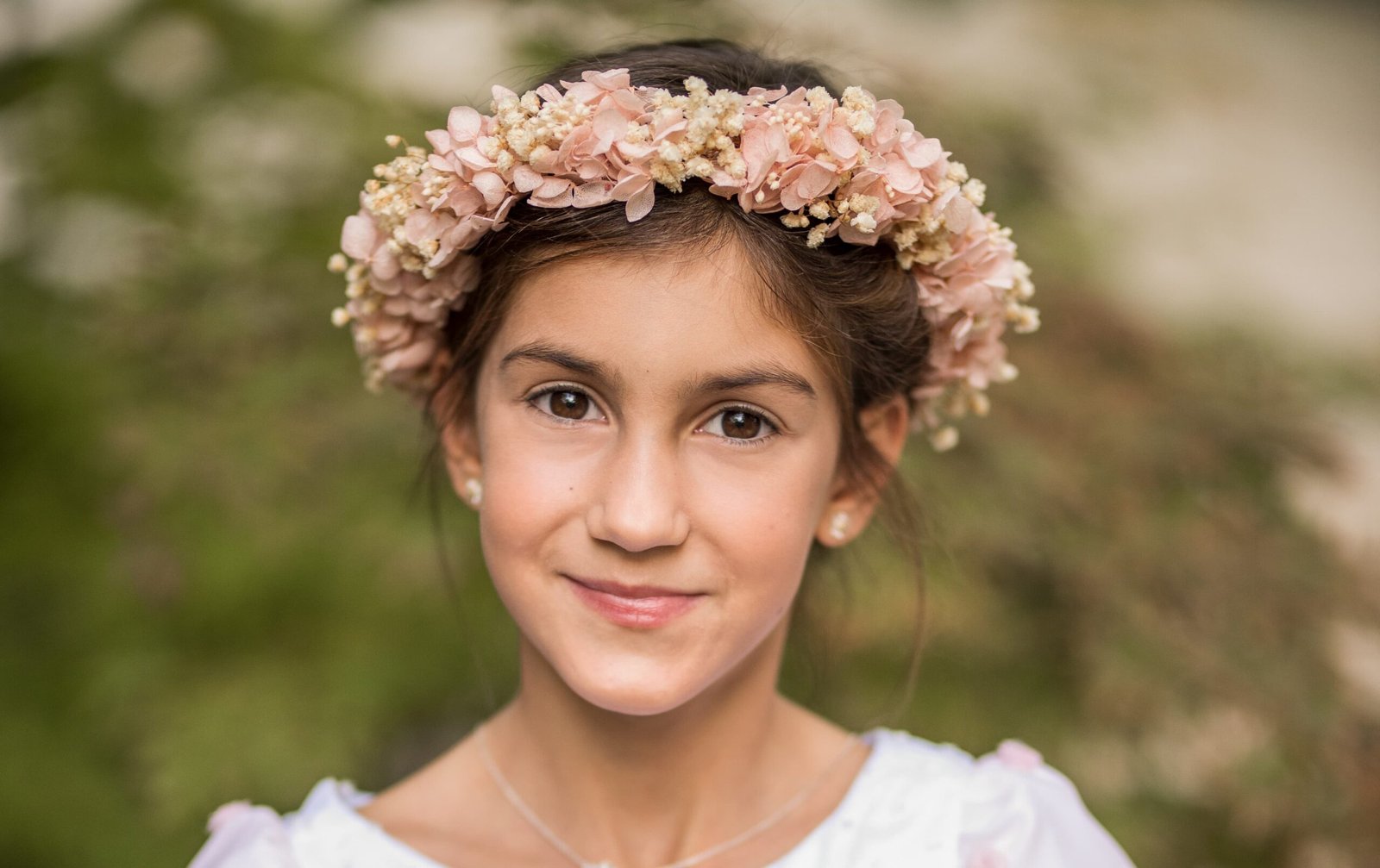 Corona con hortensias preservadas, de mini hortensias color rosa combinado con beige, ajustable con lazo