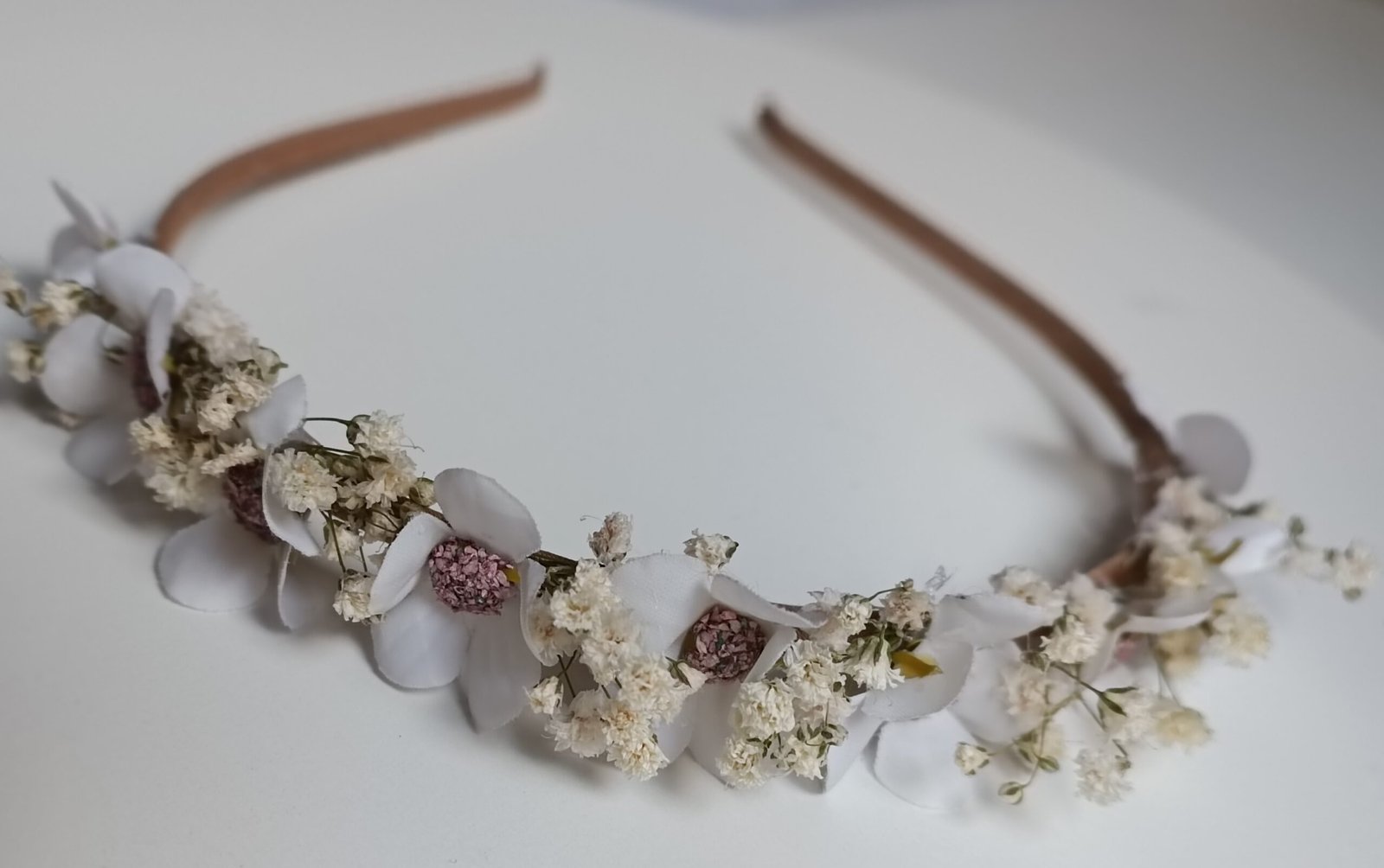 diadema forrada en seda, con flores de tela combinada con paniculata color blanco natural