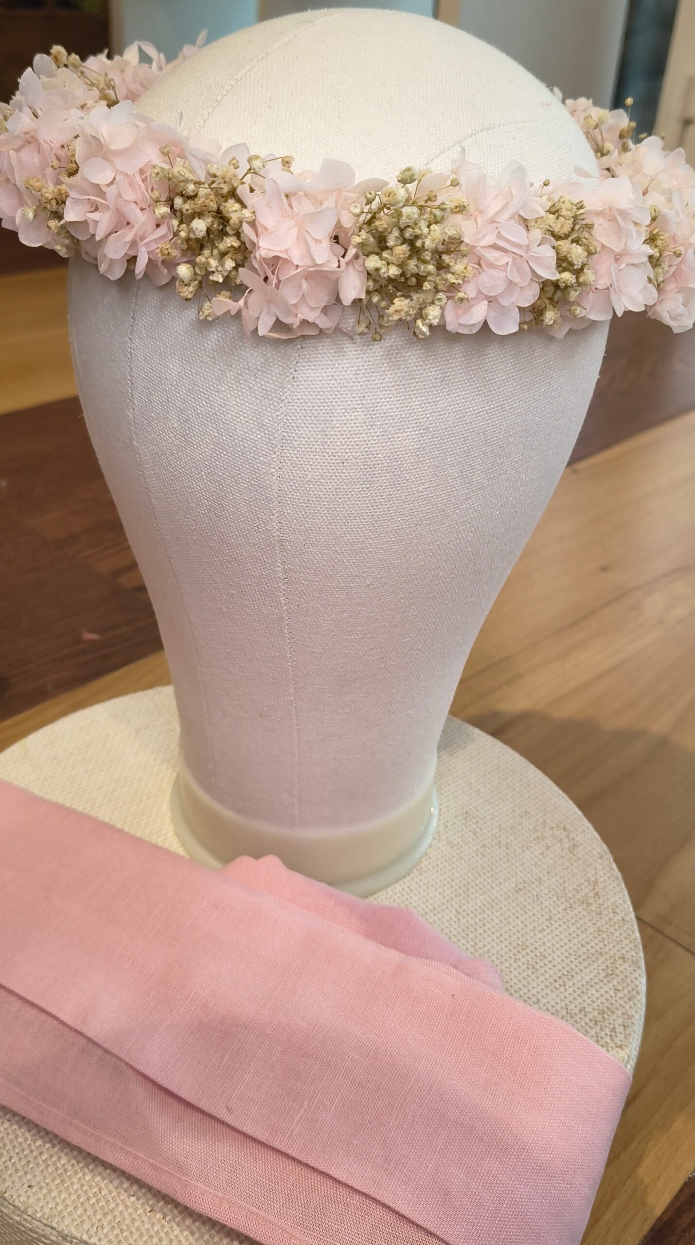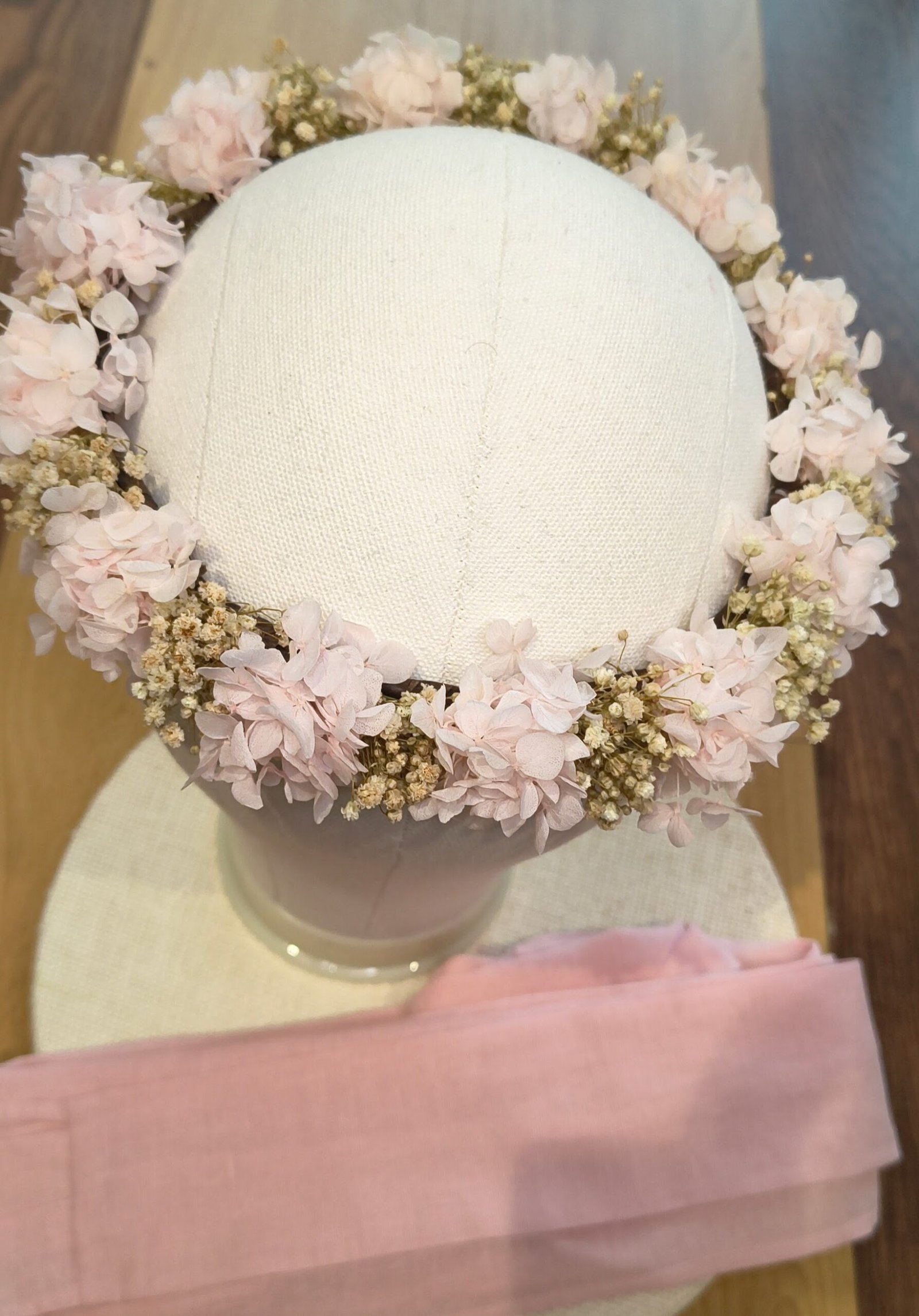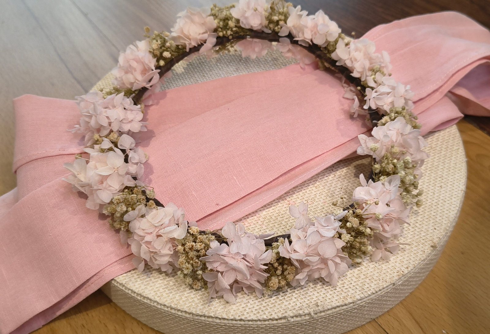 Corona de hortensias preservadas rosa palo combinado con paniculata .