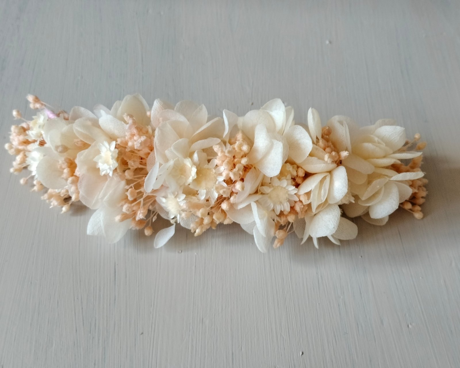 Tocado de mini hortensias preservadas combinada blanco roto y salmón