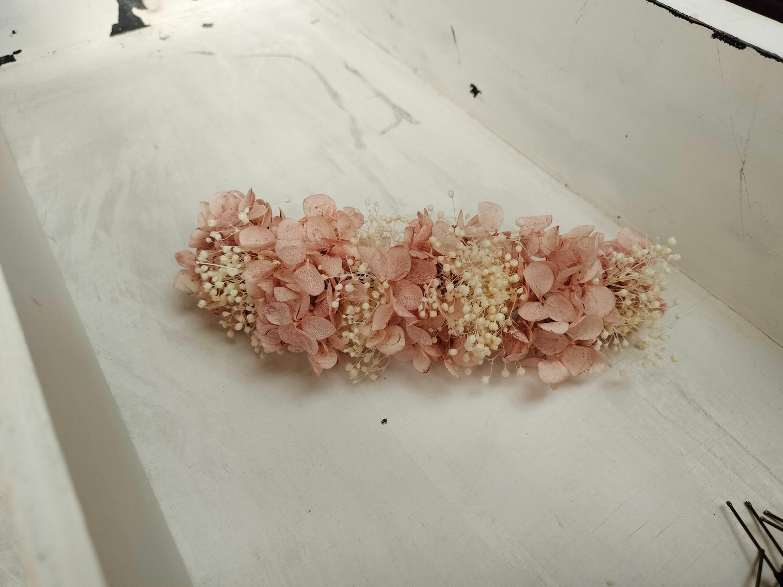 Tocado de mini hortensias preservadas combinada rosa viejo y blanco roto, tamaño de 10 a 12 cm