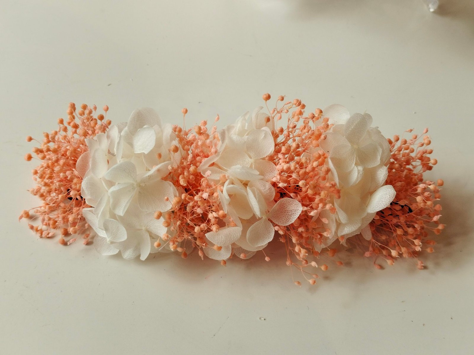 Tocado combinado de flores preservadas blanco y salmón. tamaño de 10 a 12 cm