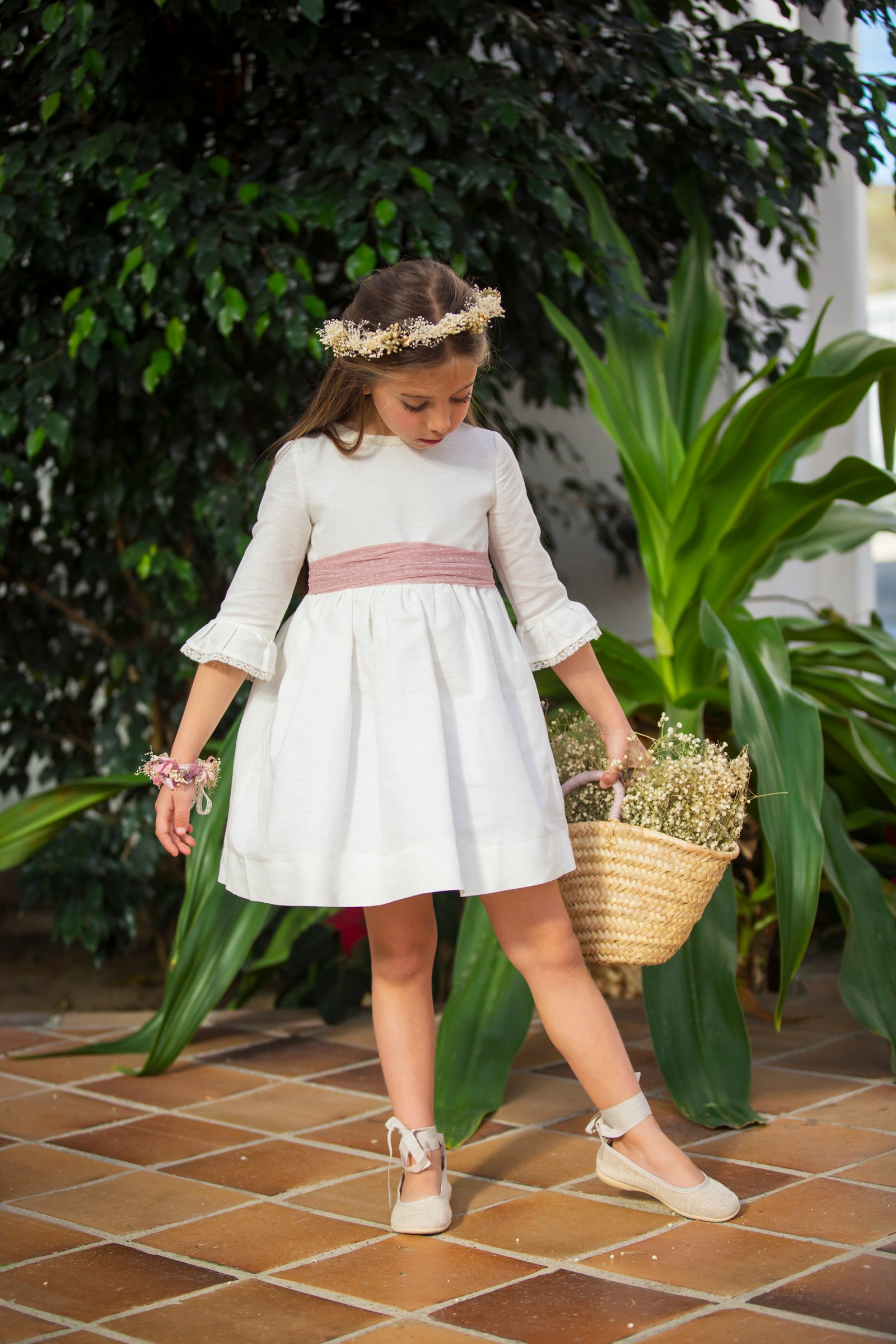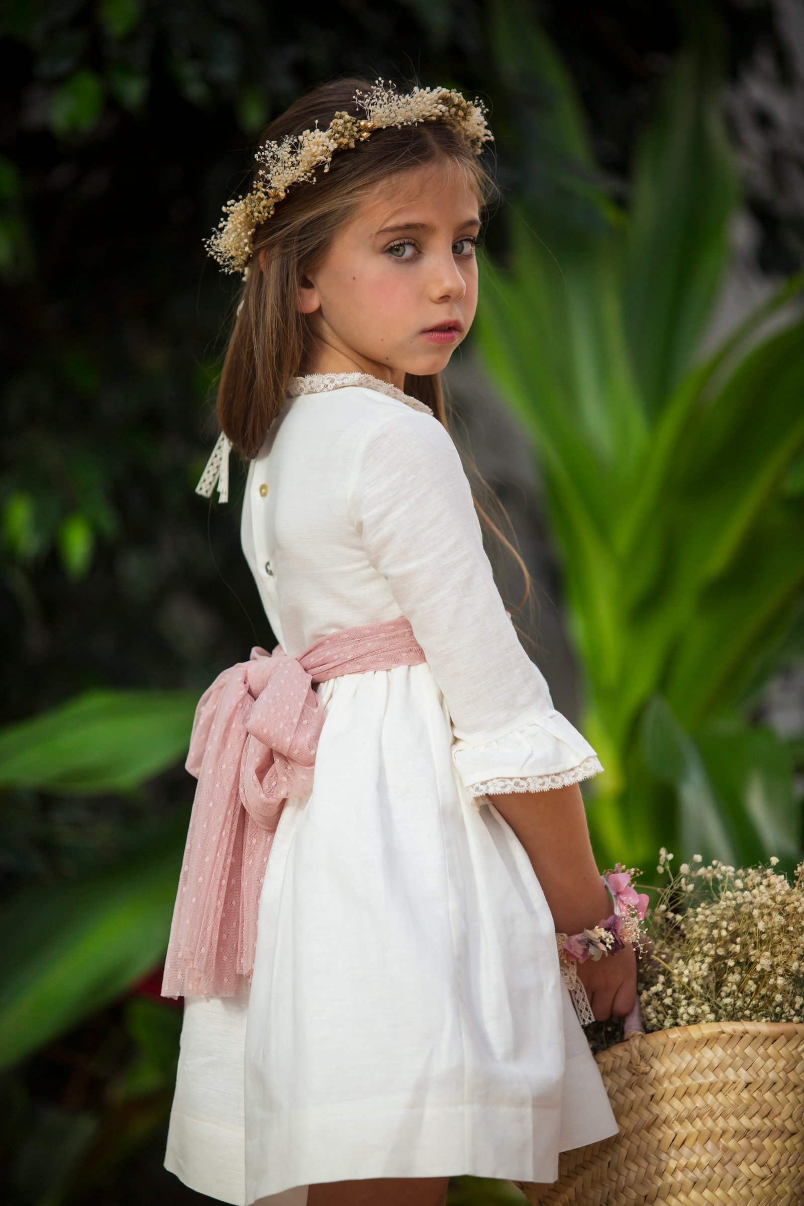 vestido Ana con manga francesa , confeccionado en lino color crudo y acabado en valencienne
