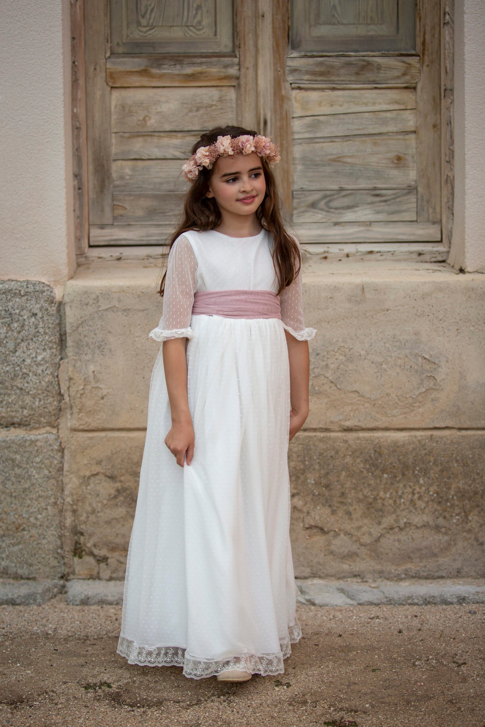 Vestido Maria en tul plumeti y puntilla de tul bordado en bajo y mangas . Cuello redondo y espada en pico. Lazo incluido a elegir color