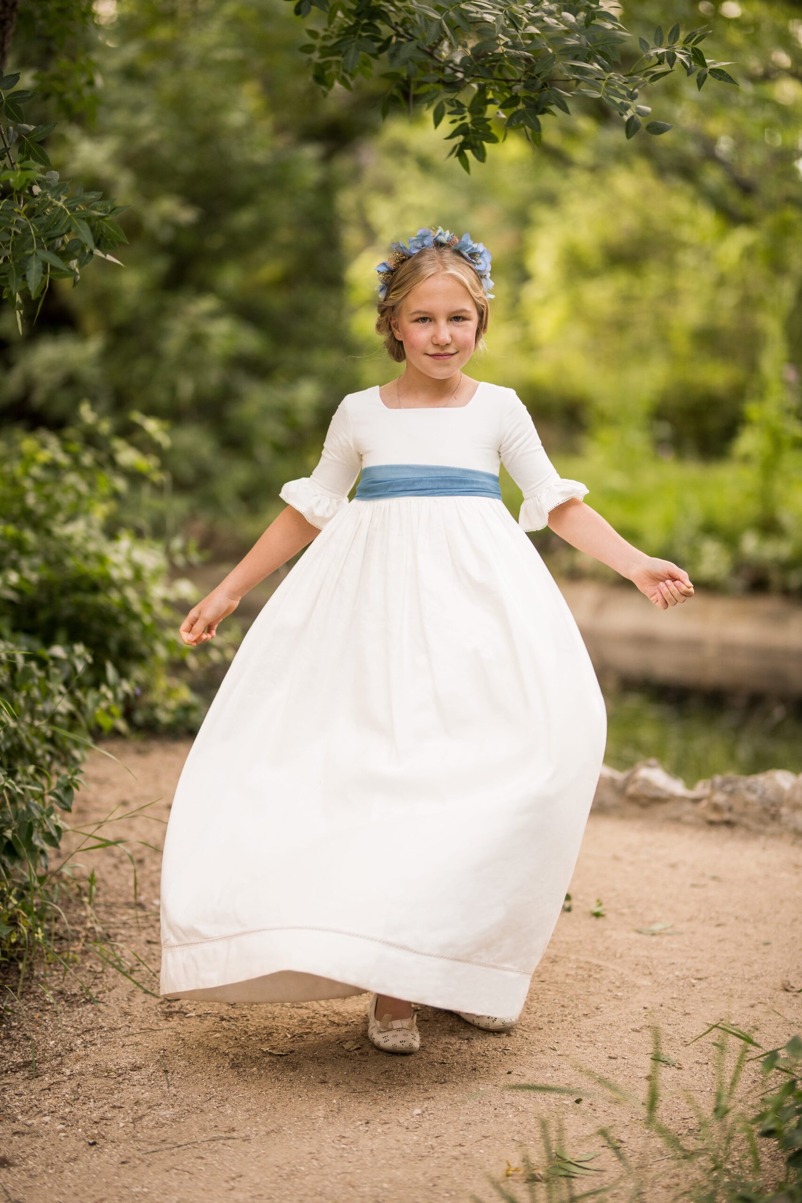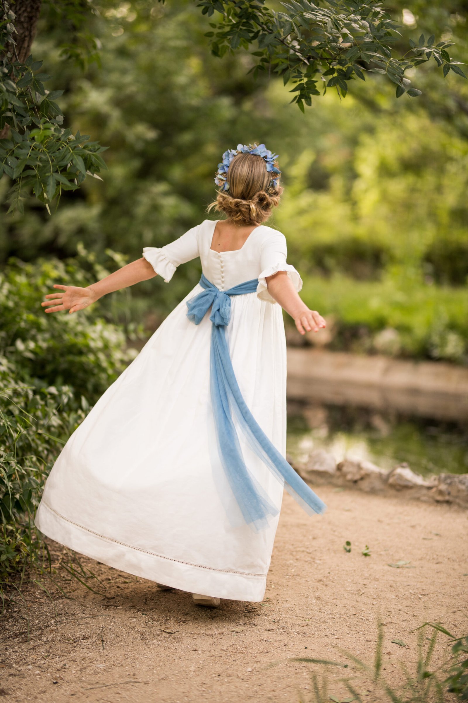 Vestido Teresa, con manga francesa, confeccionado en lino y acabado en puntilla bordada pequeña en manga, cuello y espalda cuadrada , LAZADA DE LINO inclida